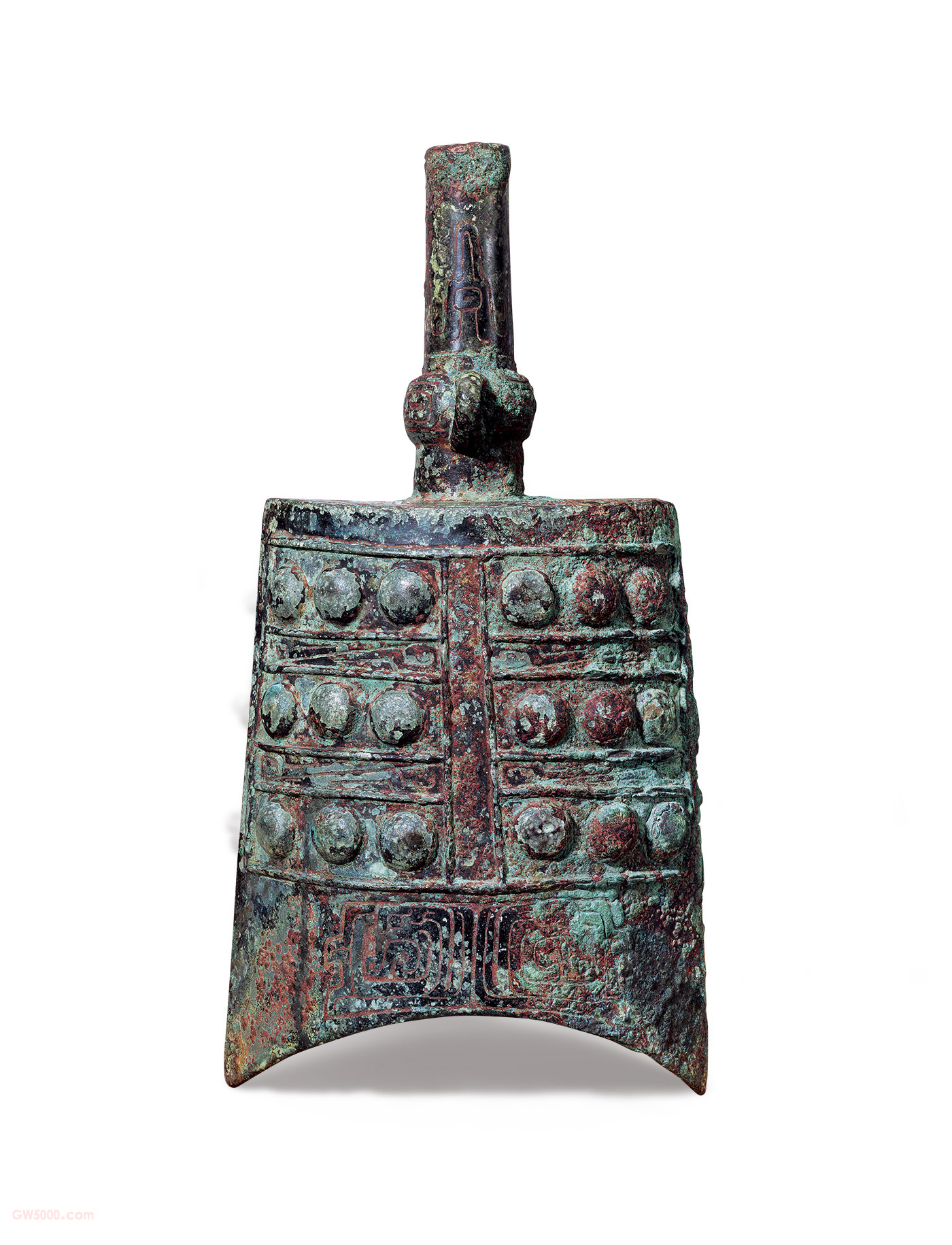 钟腔体作合瓦状,较长,口缘内凹呈弧形,舞部正中为甬,有旋、干,钟枚呈圆饼状,下沿位弱于腔高三分之一。甬上饰目纹,篆间饰以斜角云纹,鼓部中央饰相对龙纹。