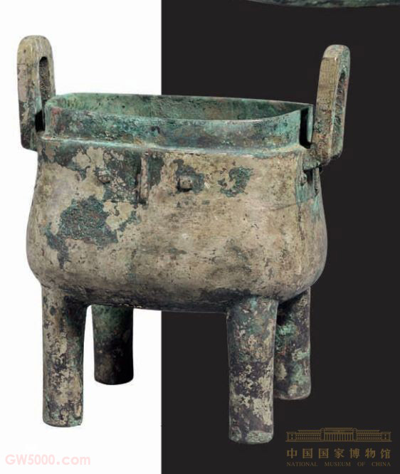 器附耳微斜,腹部呈圆角方形,深且下垂,下承四柱足。器盖扁方,与器身子口相合,上置两个曲尺形捉手。器颈部正面饰有两个乳突,似为饕餮纹的简省。