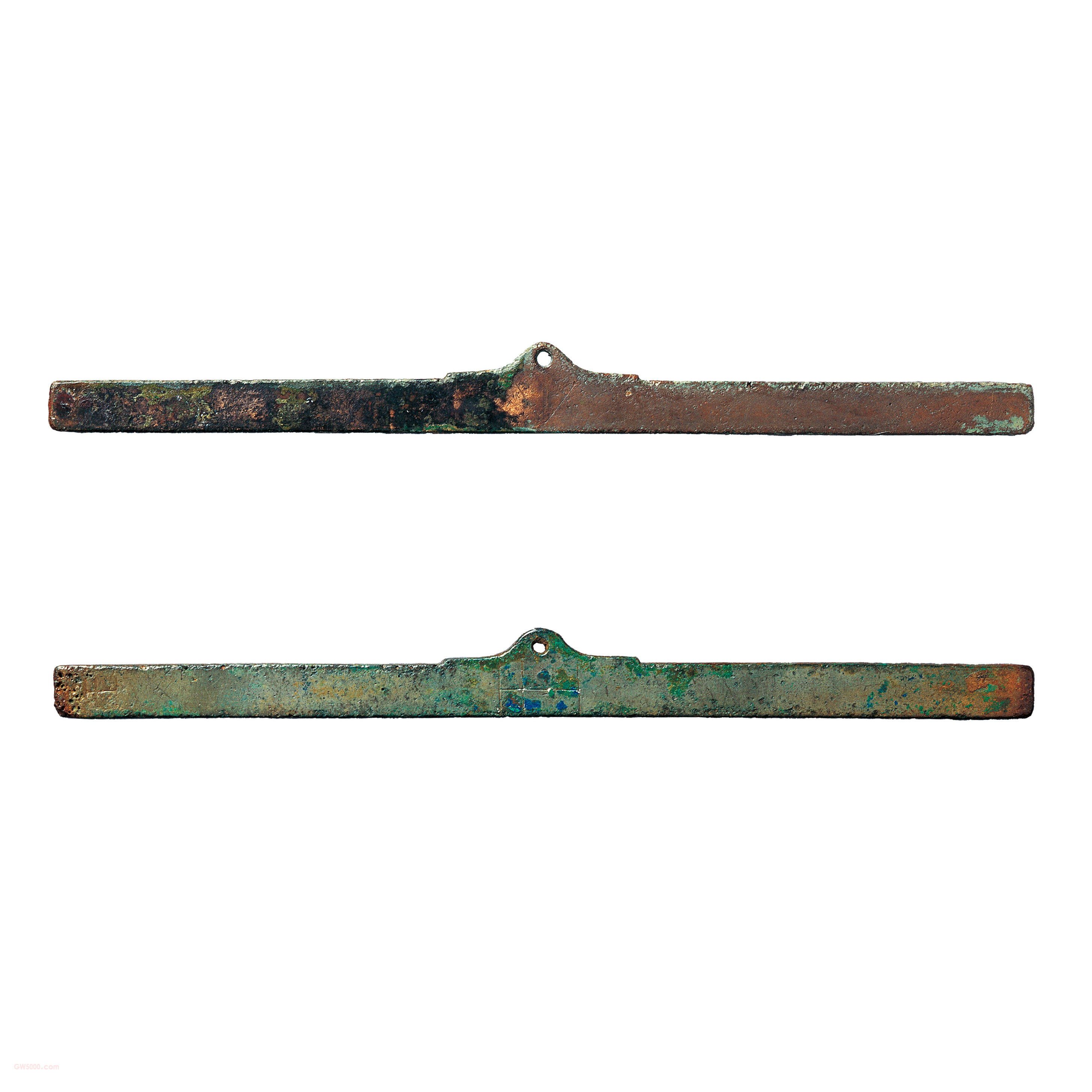 这两件青铜衡杆为窄长条形,中部上方有圆形突起,中有一圆形孔,系拴提绳的鼻钮。横杆的长度相当于战国时的一尺。两件横杆正面均刻线,一件刻十等分,每等分一寸;另一件中间两寸有寸刻线,其余每半寸刻一线。两件横杆背面均刻一个“王”字。
