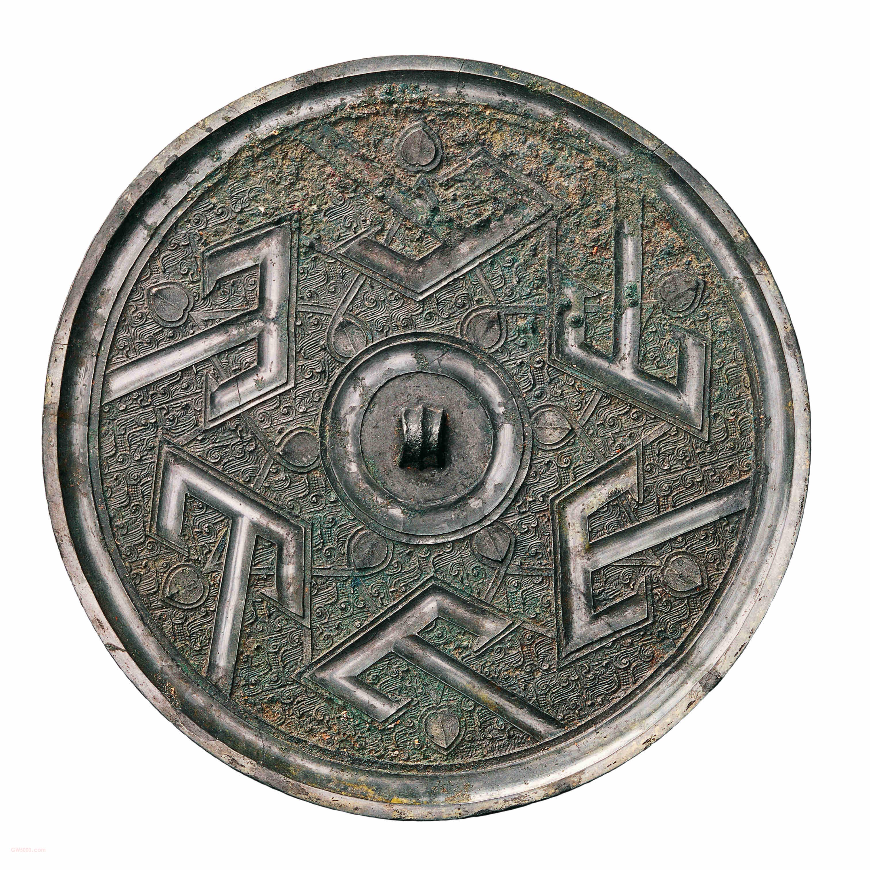 这件青铜镜为三弦钮,地纹是细密的云纹和叶纹,主体纹饰是钮周围均匀分布的6个“山”字纹。“山”字纹是战国时期十分流行的一种青铜镜装饰纹饰,有三山、四山、五山、六山几种,统称为山字镜。从北方的燕国到南方的楚国,都出产山字镜,以楚墓出土的最多。山字镜以四山镜最多,其次是五山镜、三山镜、六山镜,这样大的六山镜则十分罕见,为六山镜中的最精者。