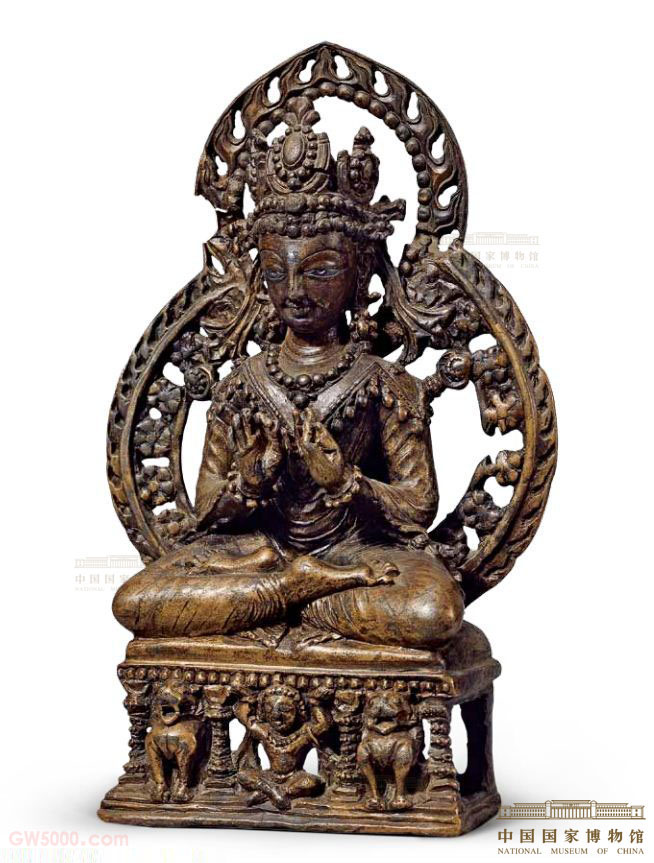 释迦牟尼佛头戴三叶宝冠,双目和白毫嵌银。身着天衣,衣褶流畅,身饰华丽璎珞。双手结说法印,结跏趺坐于矩形台座上。台座正面有四根柱子,中间为力士托举,两侧是狮子护法。佛像身后有头光和背光,背光外缘为火焰纹,内为梅花纹;头光外为火焰纹,内饰联珠纹。造像的嵌银技法与葫芦形背光形式是克什米尔地区造像特点。