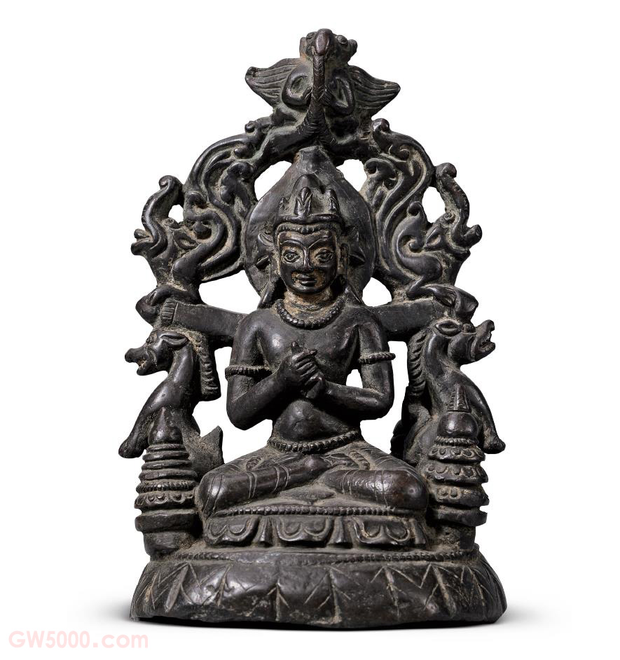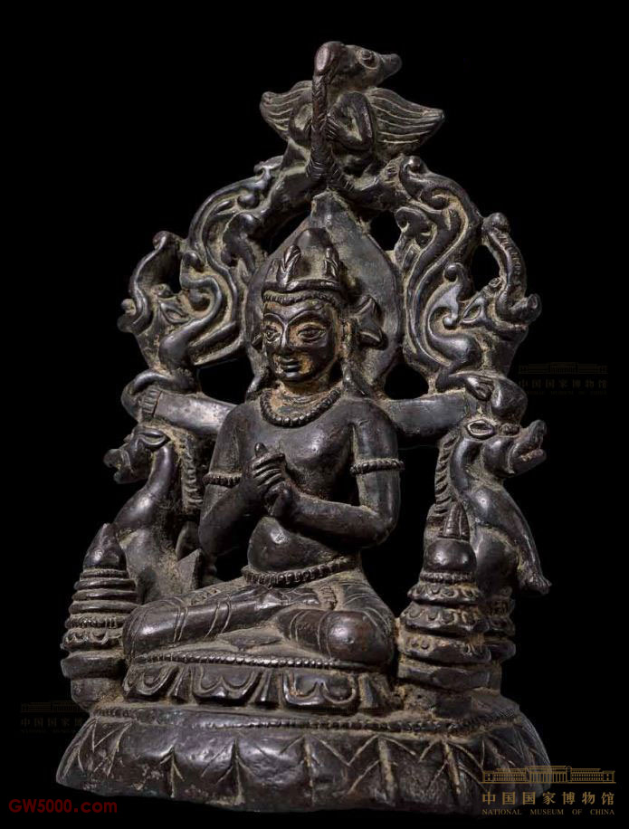 毗卢佛头戴宝冠, 双手结智拳印, 坐于莲花座上。佛像两侧各有一塔状装饰,像背是波罗风格中常见的拏具形式:正上方是金翅鸟,与肩平行的横梁上方各有一只摩羯,横梁下方是相背而立的狮羊。