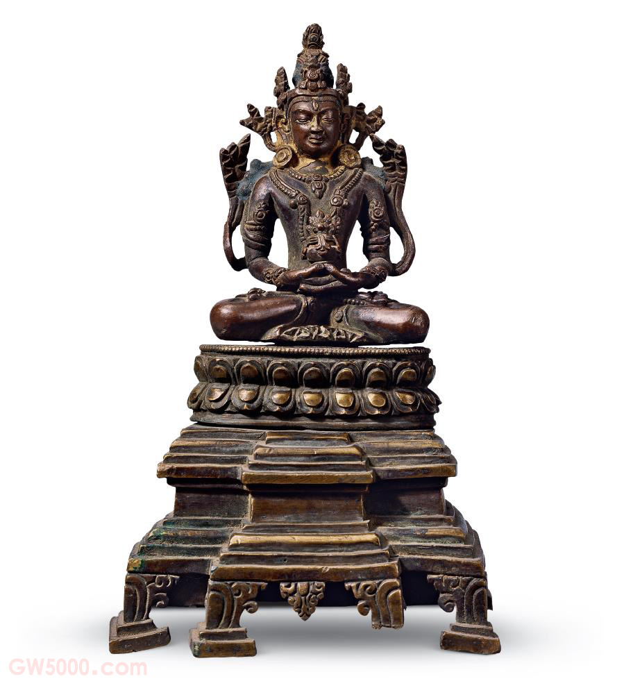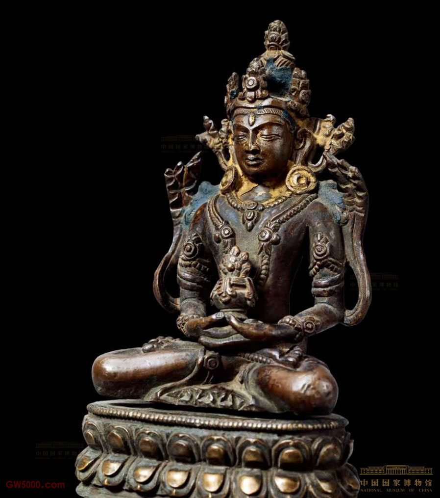 此尊造像为高发髻,头戴三叶冠,冠带上扬。肩披帛,帛带沿臂上扬,身饰项圈、璎珞和臂钏。双手结禅定印,捧宝瓶,结跏趺坐于莲座上。莲座下为折角高须弥座,这种须弥座样式源于犍陀罗地区,常见于东北印度地区造像中。