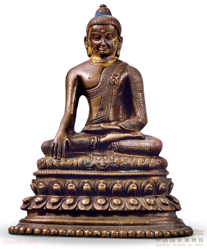 此像为螺发,双目低垂,脸形瘦削,薄唇,具有西藏人的面貌特征。佛像左手结禅定印,右手施触地印,结跏趺坐于吉祥草垫上,下为莲座,莲瓣扁平,底部为粗大的联珠纹。身着袒右肩袈裟,袈裟轻薄贴体,显露出平滑的身体轮廓,袈裟边缘处饰田字格纹样。