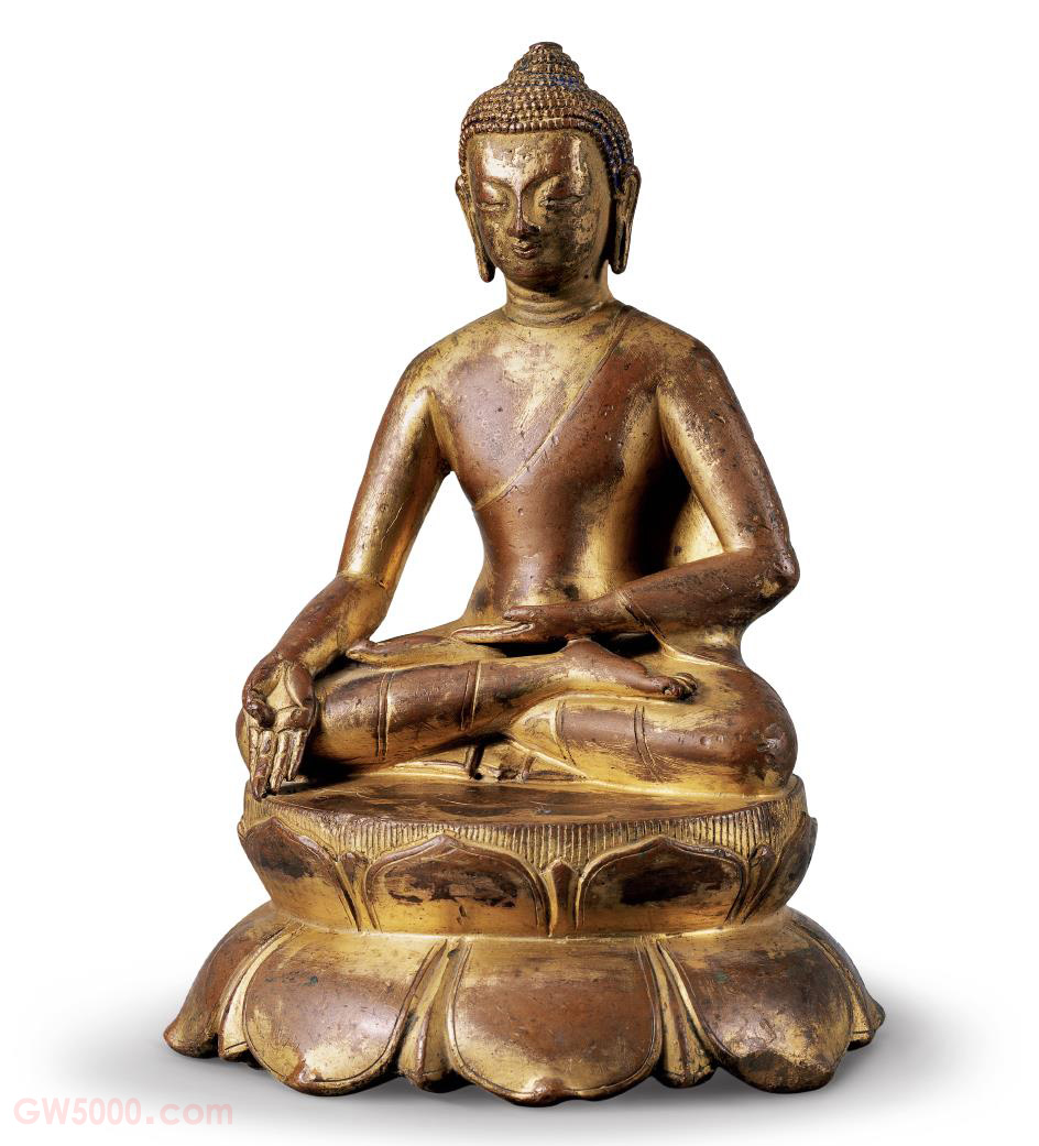 此像为螺发,着袒右肩袈裟,露出饱满的身躯。宽大饱满的莲瓣铺地,乃是模仿尼泊尔早期的造像风格。