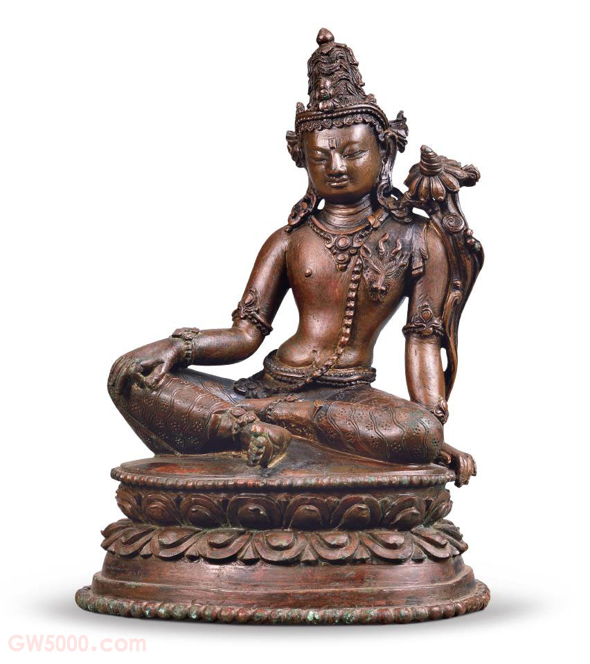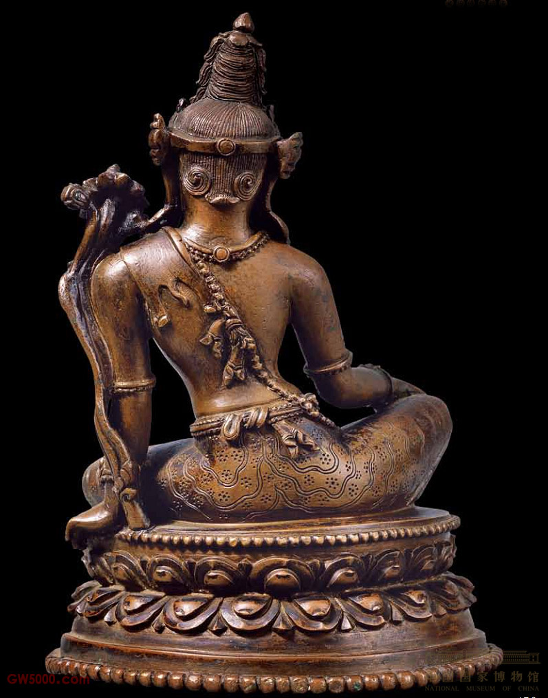 观音菩萨头戴宝冠,上身袒露,左肩斜系羚羊皮,下着刻花长裙,侧坐于莲座上。观音菩萨像的左肩上系羚羊皮,表现出菩萨具有密教神格。