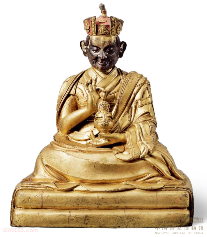 此尊造像头戴红色僧帽,身着僧衣,外罩大氅。左手禅定印托宝瓶,右手当胸结说法印,结跏趺坐于方形台座上。该台座系仿西藏高僧坐禅时所用的两层坐垫。台座背面刻藏文,译成汉文为“白玛宁切旺波”。