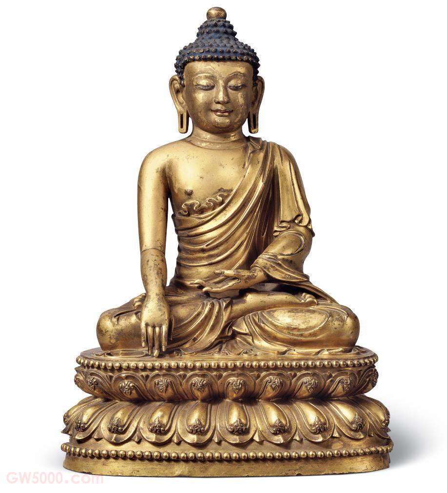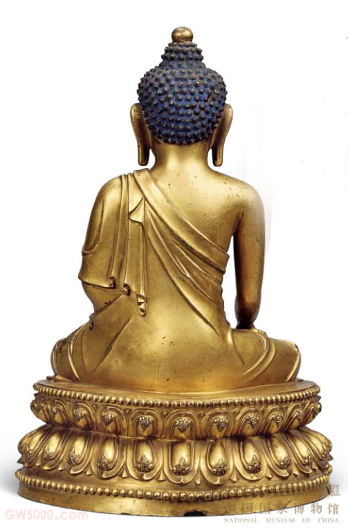 佛像面相端庄,螺发高髻,着袒右肩式袈裟,胸前与肩部袈裟的衣褶流畅。佛的胸部与腿部雕铸大量衣褶装饰,这是汉地造像与西藏地区造像的显著区别,表明两地审美观念的不同。莲座上刻“大明宣德年施”款。