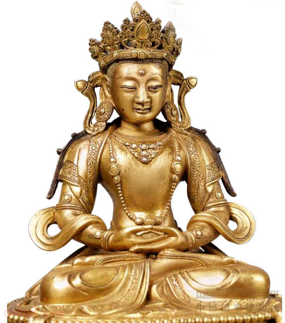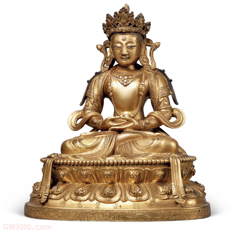 无量寿佛头戴五佛冠,发髻呈葫芦形。双肩披帔帛,帛带自双肩垂落座前。双手结禅定印,跏趺坐于莲座上。莲座正面刻汉文佛名“南无吾量寿佛”,莲座上面刻藏文佛名和“大清康熙二十五年四月初八日诚”。四月初八是“沐佛节”。无量寿佛是清宫中最重要的崇拜对象之一,代表了人们对长寿延年的渴望。