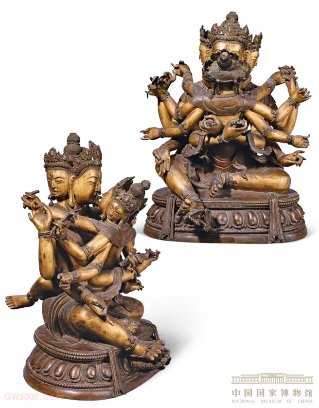 此像主尊与明妃均为三头六臂,主尊正面两手分持金刚杵和经书,其余各手持莲花、结手印。明妃各手分持金刚杵、经书及结手印。