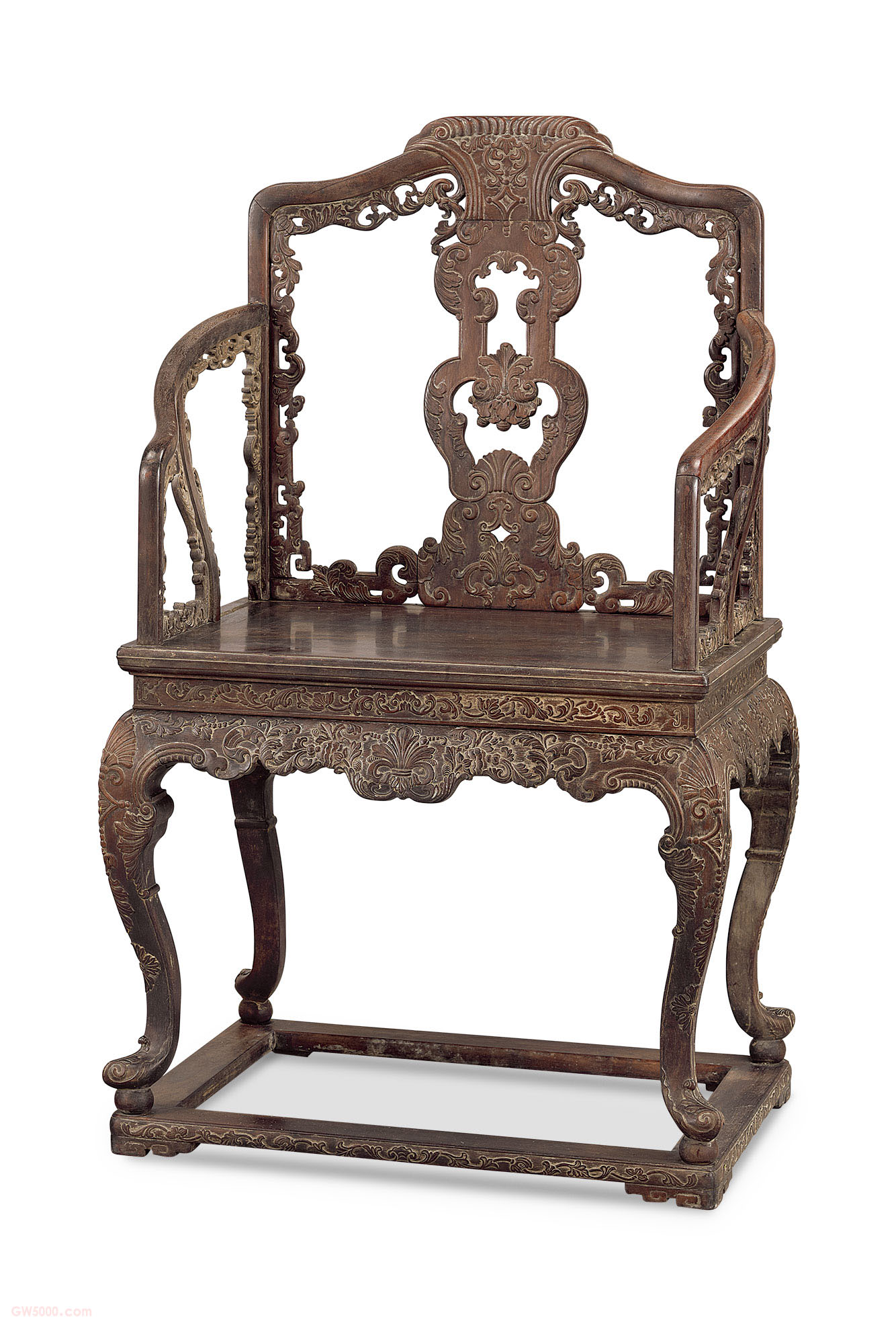 搭脑与靠背两侧立柱、鹅脖与扶手均用闷榫连接,椅面攒边打槽装板,座下有束腰,三弯腿下装托泥承龟足。此椅搭脑靠背束腰、牙板、腿足、托泥均饰西番莲花纹及卷叶纹。这对扶手椅制作于清乾隆时期,从造型到装饰均吸收了欧洲巴洛克艺术风格,尤其椅子通体饰西番莲纹,为清代家具艺术受西方文化影响的典型实例。