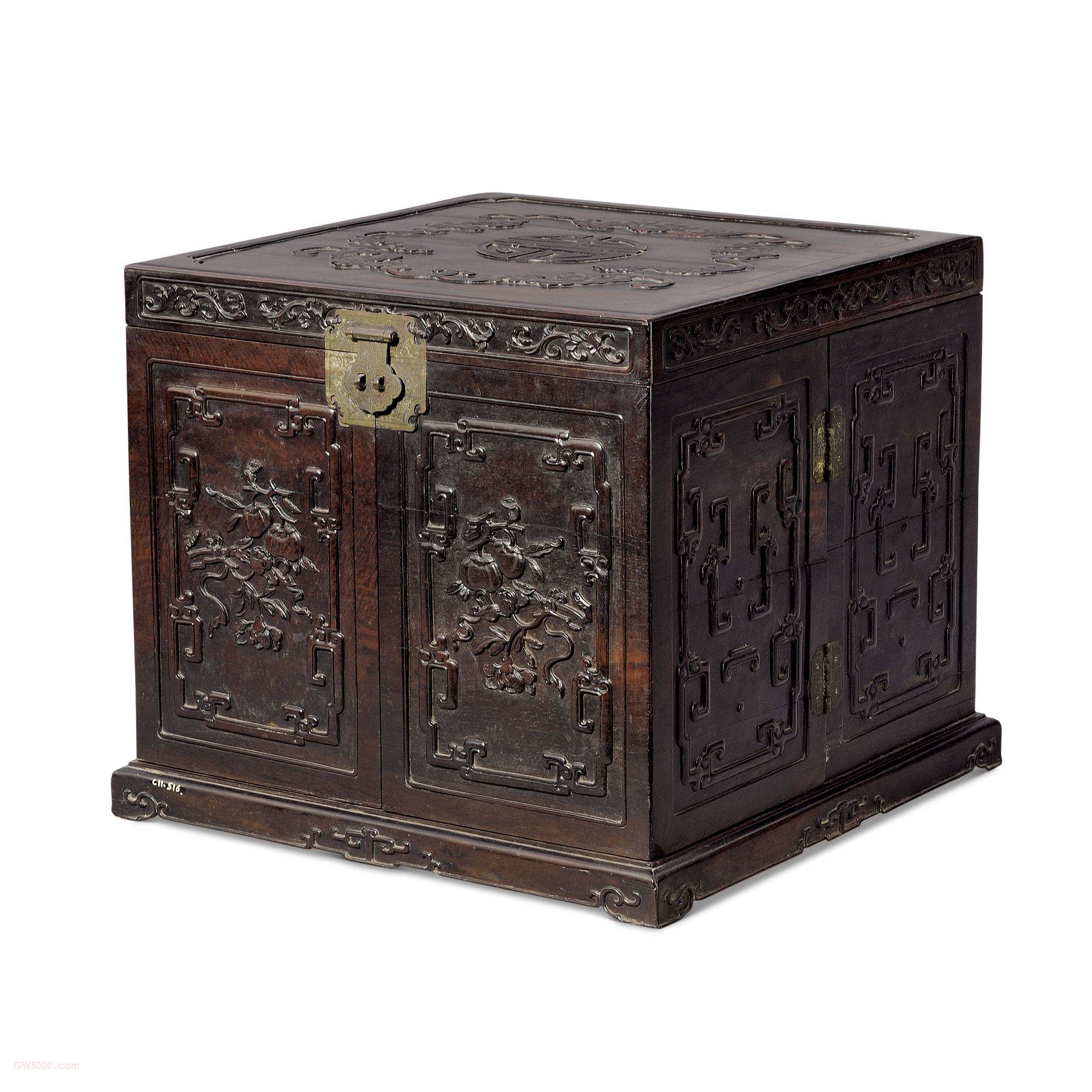 此箱箱盖平顶,子母口,箱体带壸门式台座,浮雕卷草纹。正面对开双门,上缘纳入盖口,下缘入槽,门面雕阳线起鼓。门内设抽屉五具,双门及抽屉装有铜吊牌。箱盖与箱体之间装有圆形面叶及云头形拍子,箱体两侧装有铜提环。