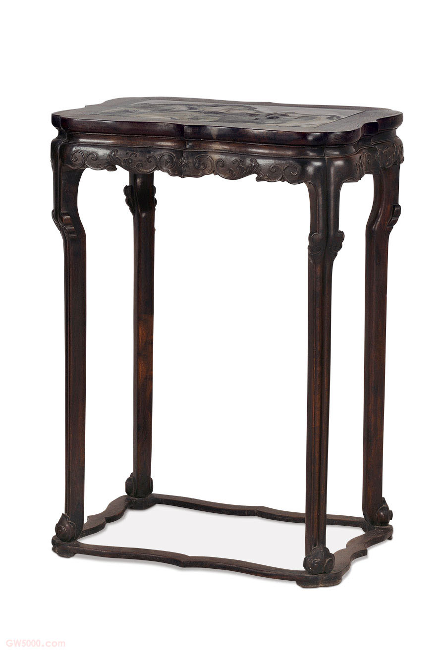 紫檀带托泥嵌云石面海棠式花几