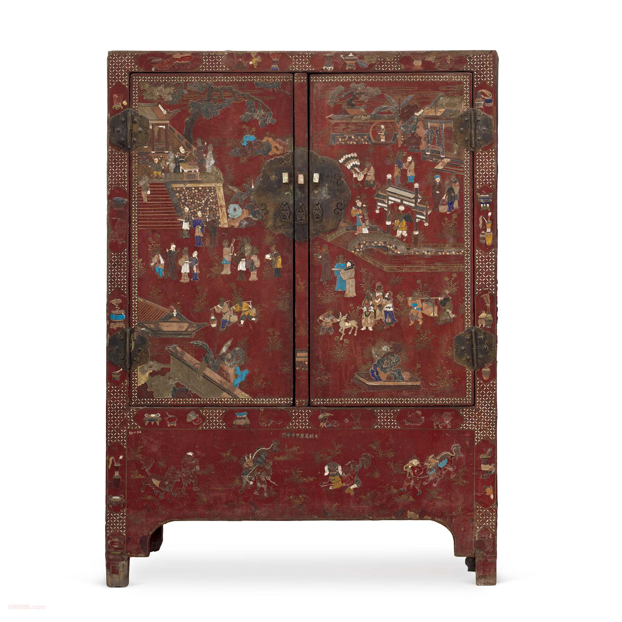 此对顶箱柜均为四面平式,双门对开,中有立柱,八出如意云头式白铜圆面叶分嵌双门,三钮头,挂镂空双螭团捧灵芝吊牌,六出如意云头式合页。柜门内各有三条穿带,抽屉承架遗失。柜面通体为百宝嵌庭院祝寿场面,主人高坐楼阁,文武官员往来贺寿,仆人奔走忙碌,庭院楼阁、小桥流水、梧桐、奇石、芭蕉、仙鹤、梅花鹿等景物灿然,内容丰富。柜面下方各有四组百宝嵌胡人献兽图,间嵌“大明万历甲申年制”款。柜边框满嵌博古图连续纹样,包括鼎、觚、爵、佛手、香炉、赏石、文房用具等。柜两侧面嵌折枝花鸟纹样。百宝嵌使用的材料包括:象牙、骨、木、玉石、螺钿、寿山石、料器等。此柜体量巨大,形制古雅。纹饰内容丰富,装饰用材高档,朱漆沉稳而鲜亮,断纹自然,柜内通体裱衬黄绫,款识纪年明确,应是目前所见明晚期大漆家具珍品,具有重要研究价值。