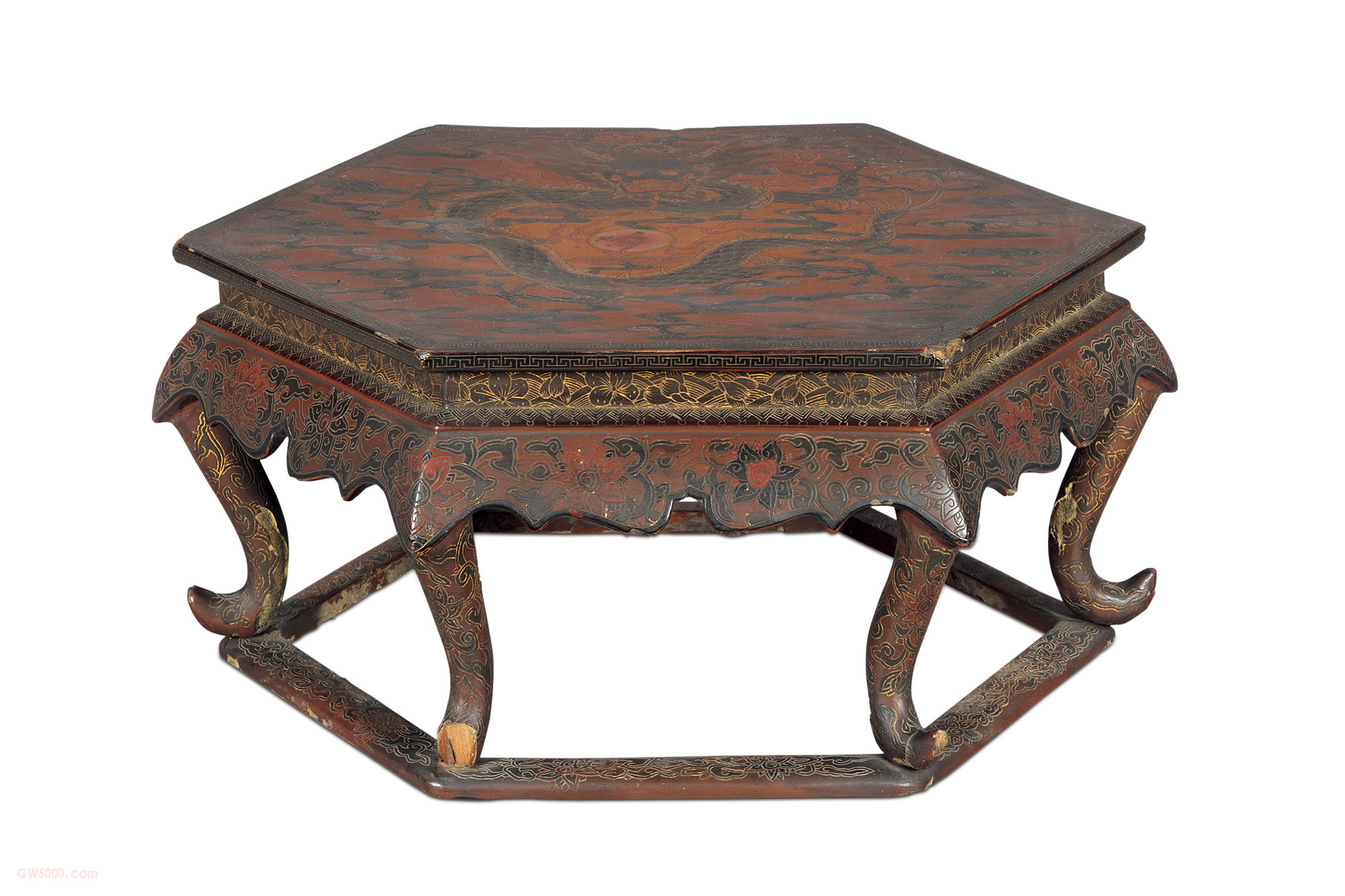 几面六边形,束腰下衬托腮,下承向外膨出的披水牙板。三弯腿,足外翻,下承六方形托泥。此几形制小巧,造型美观。通体髹朱漆地。几面雕填四爪正面蟒龙,间布朵云纹,几面边缘和边抹饰以回纹。束腰戗金花草纹,托腮方菱纹;牙板、腿足及托泥均雕填戗金花卉卷草纹。此几代表了明晚期复杂精湛的漆工艺水平。