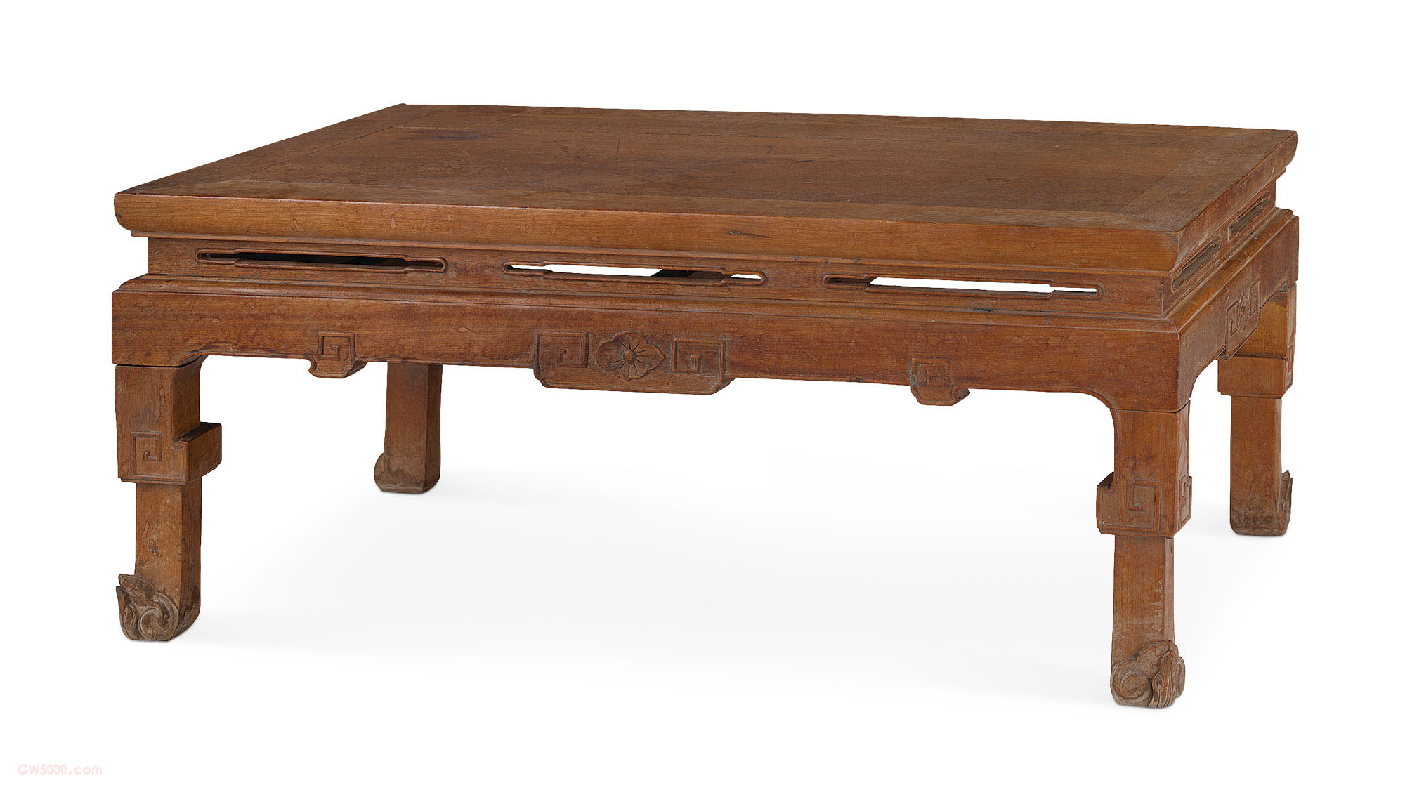此桌金丝楠木制,桌面攒边打槽装独板面心,下装两根穿带用以承托面心,边抹冰盘沿,束腰装绦环板挖扁平海棠式鱼门洞。沿边起饱满的灯草线,牙板与腿子沿边起阳线,在牙板中间交接呈回纹,洼堂肚。腿子为倒垂如意腿式,向下延展至地面为如意云头纹足。此桌为折叠桌,从肩部以下四腿为活腿,在腿子正中由一金属固件连接,牙板洼堂肚内侧,由转轴结构连接安两个攒边木框,用以固定收起的桌腿。收起时,四腿朝内斜角置于桌面底部,攒边木框向两侧打开置于腿子之上,外侧的木框上装一活榫,固定时插在侧面牙板内侧。整桌折叠结构设计合理,线脚及工艺精致细腻,附有清室善后委员会签条,应是少见的清宫楠木小型家具实例。