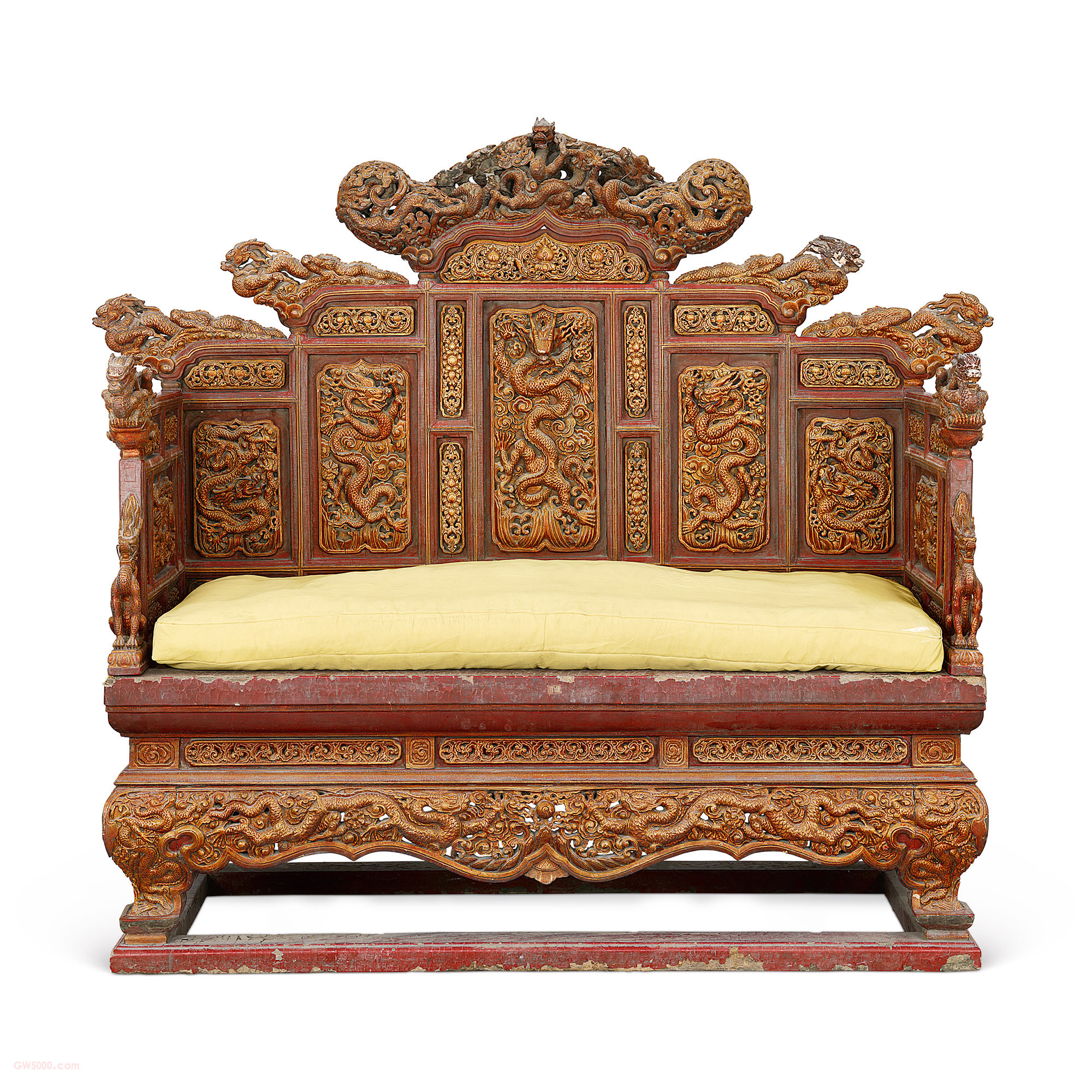 这件宝座为五屏式靠背,正中搭脑透雕饰一正两侧三条龙纹。靠背及扶手顶部饰六条圆雕龙纹,扶手前端各饰圆雕龙纹站牙。靠背与扶手均在开光内雕龙纹,边框内雕宝相花及缠枝花卉纹。座下有束腰,并在开光处雕有云纹装饰。束腰下彭牙透雕二龙戏珠纹。宝座体型硕大,做工精良,朱漆为地,凡有纹饰处均髹金漆,辉煌庄严。此宝座原安放在国子监辟雍殿,是皇帝讲学时所用,宝座在形制、纹饰上与实用家具风格迥异,是极珍贵的清代礼制家具实例。