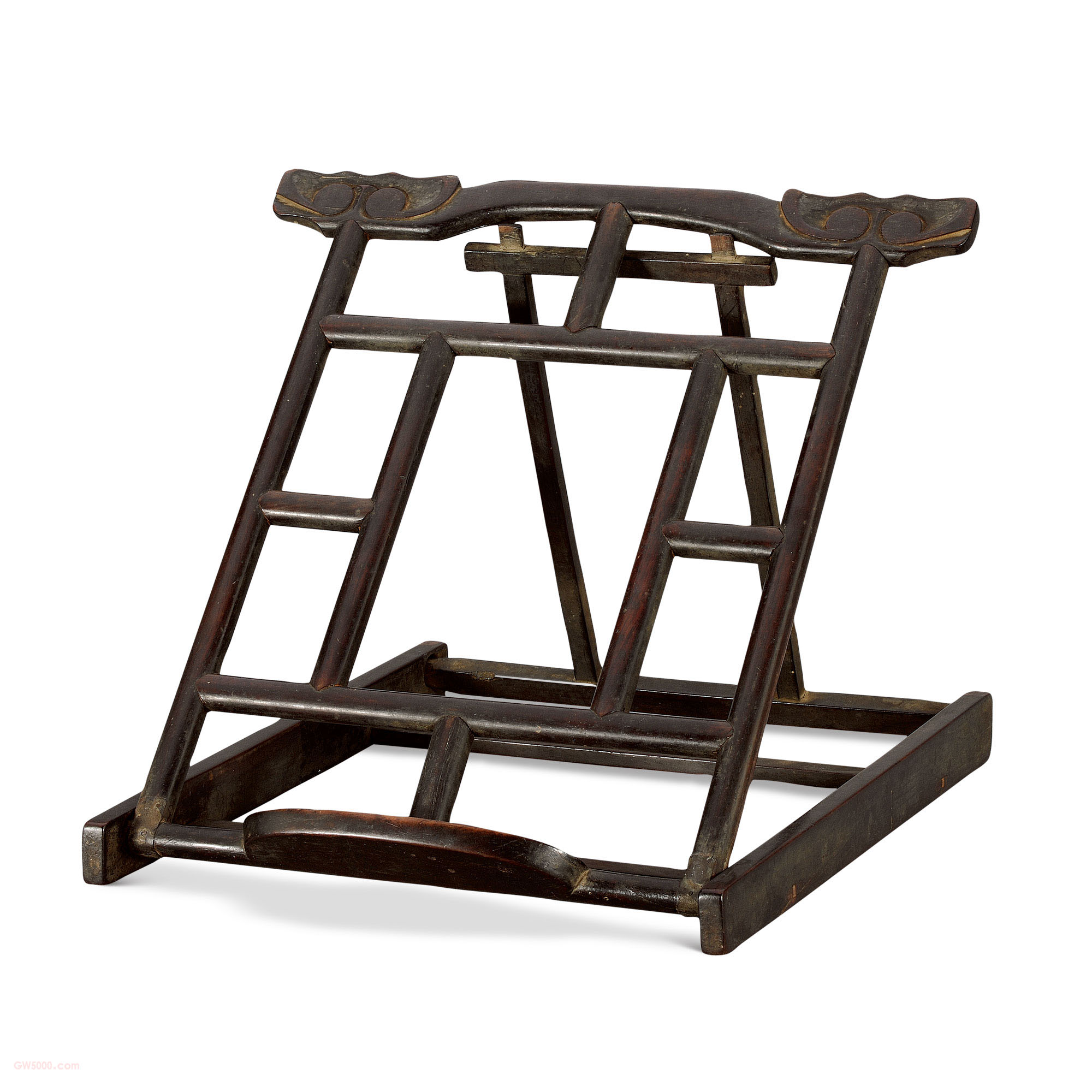 此镜架通体为黄花梨木制,镜架主体用攒框,分成三层九格。镜架搭脑两端雕刻如意云纹纹饰。正中为正方形,上下两端以条板相互连接,两侧短柱将上、中、下三部分连接贯通,架下置放了更大的方格状框架。镜架中部有可折叠的支架,以备承托不同大小的铜镜。此镜架造型简洁疏朗,非常雅致。