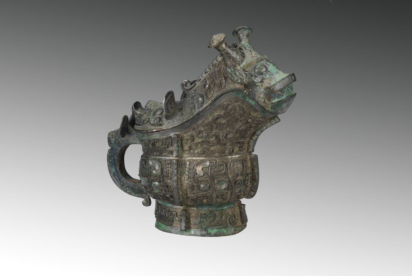 高21.5厘米,长24厘米。1976年灵石县旌介村出土。酒器。整体状如蹲兽。前有宽流,下承高圈足。盖前端为龙首形,与上翘的流口扣合为颈,高浮雕粗角、尖耳,眉目突出,颈部起扉棱至盖面中部;盖后部作兽面,双耳高耸;器腹前、左、右起扉棱,后有兽首形鋬。盖部以云雷纹衬托两个兽头,器身则以三条扉棱为中轴组成兽面主纹,口沿下饰昂首卷尾夔龙纹,圈足饰夔凤纹,均以云雷纹衬地。三层花纹。商代晚期青铜器精品。
