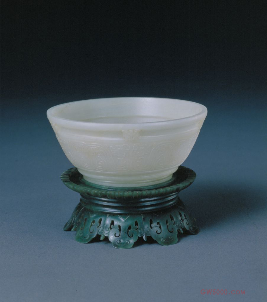 青玉夔纹碗,清乾隆,碗高6厘米,口径13.1厘米, 连足高10.1厘米,足径11.3厘米。我国传统的装饰纹样之一。夔,神话中形似龙的兽名。《庄子·秋水》中言:“夔怜蚿,蚿怜风。”释文:“夔,一足兽也。……其状如牛,苍色无角,一足能走,出入水即风雨,目光如日月,其音如雷,名曰夔。”
