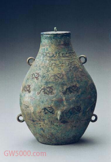 扁圆形壶身,椭圆形平盖,盖中立一环形捉手。其器身束口、溜肩、鼓腹、平底,项与下腹部个有一对环纽,上下呼应,而在下二纽之间,另有一环,其五只环用途,可能为负重运物的穿索固定。在壶颈处,各有鸟纹和象纹一周。在壶身上,用镶嵌红铜工艺装饰出龙纹和菱形纹,均匀分布。疏朗明快,在青铜器中少见。