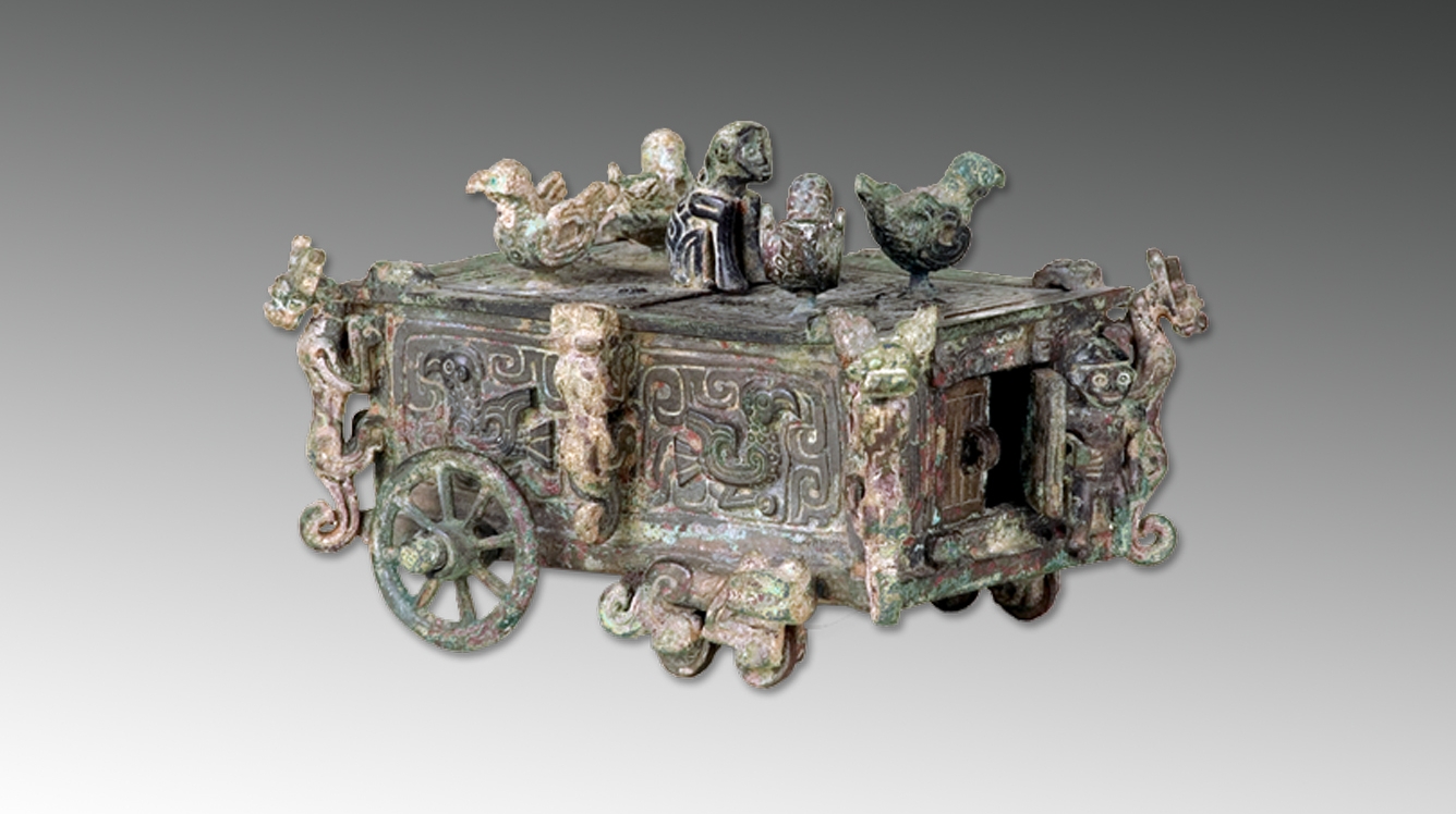 高9.1厘米,长13.7厘米,宽11.3厘米。1989年闻喜县上郭村出土。厢式六轮车。车顶部有双扇盖可以开启,盖面嵌有一猴形捉手,周边围绕四只振翅欲飞的小鸟,器壁饰相背的凤鸟纹,并有兽形装饰,器足由两大、四小共六个轮子组成,可挽环牵引,可用手推转动。器壁一侧有一小环,另一侧开一小门,门扉上立一受了刖刑的人,头戴尖帽,左脚残,左手持拐杖,门栓从此人的右臂腋下穿过,控制车门开闭。整个器物可转动的部位共计15处,共有猴、虎、鸟等14个动物,形象刻画了西周贵族“域养禽兽”的苑囿之景,与《周礼》“刖人使守囿”的记载相吻合。西周晚期青铜艺术精品。