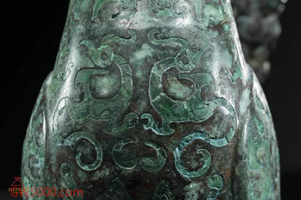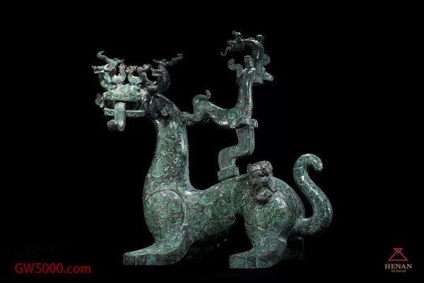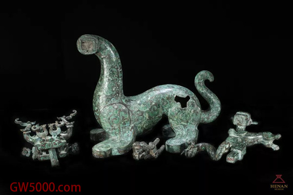 主体为龙首、虎身、龟足,龙张口吐舌,犬齿犀利,龙首上以六条蜿蜒纠绕的小龙构成兽角,背部曲形架上立一同样形态的龙形奔兽,遍布全身的龙凤纹饰,由翠绿色的孔雀石镶嵌而成。