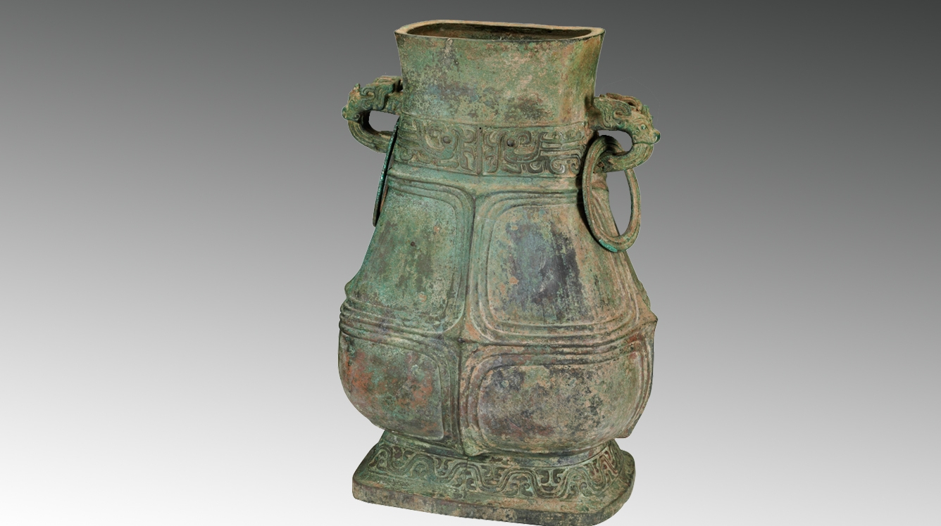 通高41厘米,口长17.3厘米,宽12.6厘米。1980年征集。盛水或盛酒器。长方口,平沿,下腹外鼓,高圈足。肩部两侧有兽首衔环。颈部饰凤鸟纹,腹部为十字条带纹,圈足饰波曲纹。口内铸铭文4行24字:“唯王二月初吉壬戌,虞侯政作宝壶,其万年子子孙孙永宝用”。虞国都城在今山西省平陆县张店镇附近。公元前655年晋国假道灭虢国后,返回途中灭虞国。虞国铜器存世极少。虞侯政是至今已知唯一的一个虞君的名字。