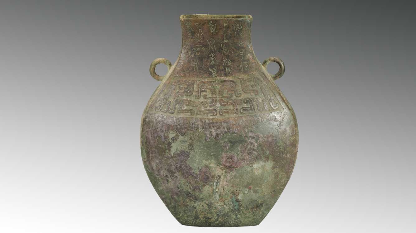 通高28.5厘米,宽22厘米。1978年闻喜县上郭村出土。盛水或盛酒器。自铭为瓶,扁平椭圆形,肩部饰卷曲相对的夔纹。颈部铸铭文5行20字:“陈公子信父作旅瓶,用祈眉寿,万年无疆,永寿用之”。西周时期陈国器。陈国铜器存世极少。