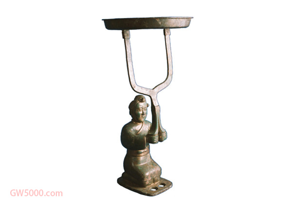 铜灯由跽坐人、灯架和灯盘三部分分铸铆接而成,可进行拆装,且各部分之间对接紧密,整体髹漆尽脱。跽坐人偏髻、束冠、身着右衽深衣,腰系以带钩扣合的革带,双手合擎“Y”形灯架,架上托环形灯盘,盘内设烛座三个。跽坐人面部结构准确,表情沉静,形体塑造规矩严谨,将举灯人谦卑、恭顺的形象表现得淋漓尽致。
