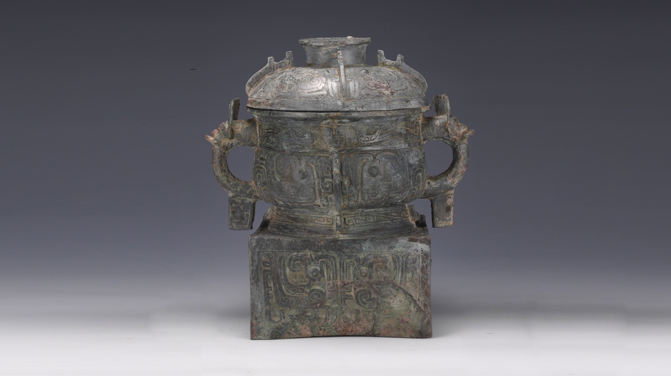 通高34.5厘米,耳间距33厘米。2006年绛县横水墓地出土。圆形带盖,圈形捉手,侈口,束颈,双兽头垂珥耳,鼓腹,圈足,方形座,座内有悬铃,带舌。盖面以四条扉棱分出四组凤鸟纹,捉手面饰凤鸟纹,颈部饰两组相对长体凤鸟纹,以兽头分割,腹部以扉棱和双耳分割为四组凤鸟纹,方座四面均饰相对凤鸟纹,均以云雷纹衬底。
