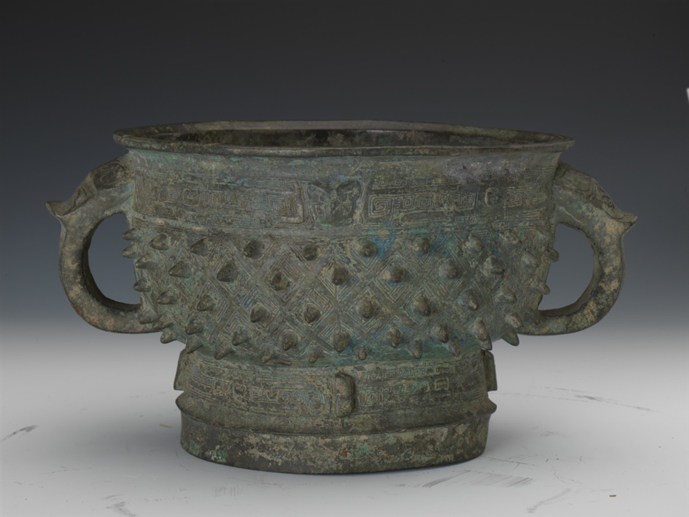 口沿微侈,圆腹,两侧置兽首鋬,口沿下饰兽面纹,前后居中各有一浮雕状兽首,高圈足,圈足下有一宽阔的边条。腹部纹饰以斜方格状雷纹为底,其上作百乳,乳钉成尖突状;圈足饰有兽面纹及四道短扉棱。