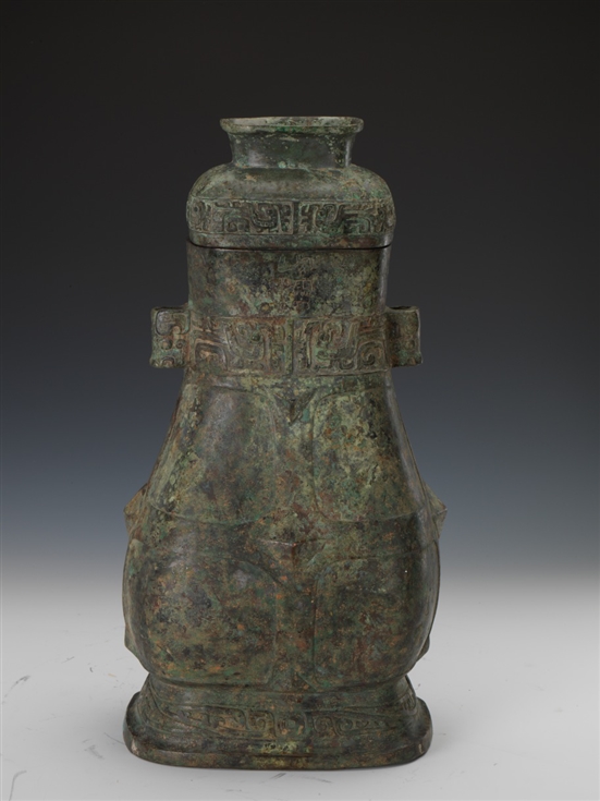 西周 一级 高44.6厘米 口径14.5厘米 此壶为长颈椭方形,壶盖较高,盖顶作圈足状,盖腹壁直深,倒置可做杯用。颈部有双贯耳,下腹部垂大,圈足高而外撇。壶通体饰有纹饰,盖口沿、颈部均饰有凤鸟纹饰带,腹部饰以十字界栏,将器腹外分为八区,每区内无纹饰,界栏交汇处有浮雕的三角锥形纹饰,器盖内与口沿处皆铸有铭文“嬴霝德作執壶”六字。