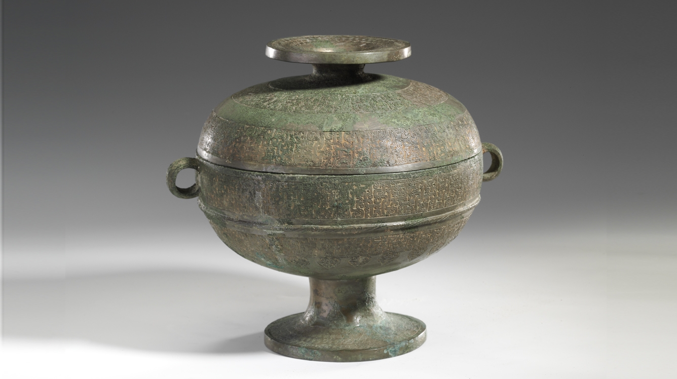 盖与豆盘扣合后呈扁球形。盖呈覆碗状,圆形捉手,母口,可与豆盘子口套合,豆盘深腹,小平底,下承喇叭形矮柄圈足。豆盘两侧置环耳一对。盖面捉手饰花纹四周,由里及外,依次为三角回纹、绹索纹、勾连云纹和云头三角纹。盖和豆盘饰宽、窄蟠虺纹四周,纹样紧密,以凸弦三角纹为界纹。口沿上三周“>”纹,下腹为垂叶纹,其中用一对“S”形夔龙作填纹。环耳饰贝纹和绹索纹。纹样图案化,分节环印,接痕清晰。