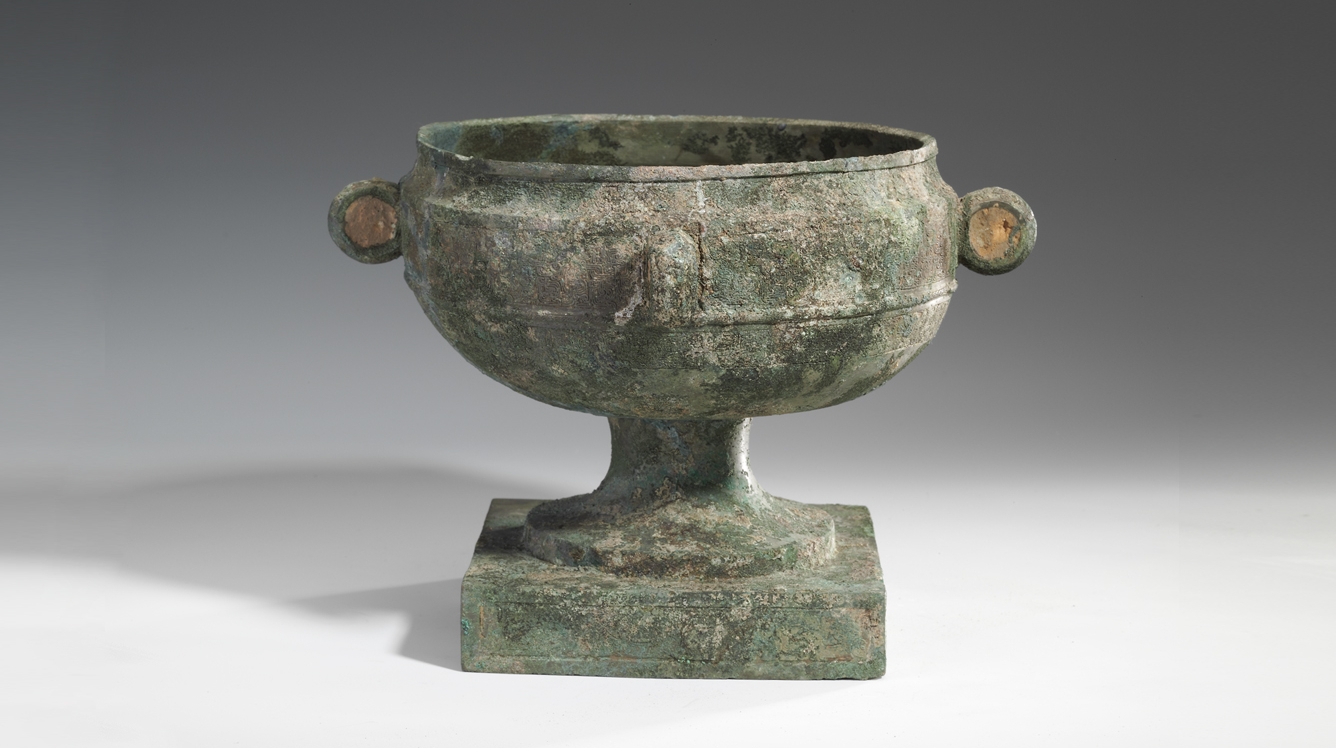 平沿,折唇,敛口,束颈,鼓腹内收,腹壁上置对称的四个环耳,圜底,喇叭形矮圈足,下承方形座。盘壁有宽、窄两周细蟠虺纹带,颈部饰粗绹索纹,环耳饰回纹和贝纹。方座上饰“S”形蟠螭纹。豆是盛放腌菜、肉酱等调味品的器具。礼器中的豆多以偶数组合使用。