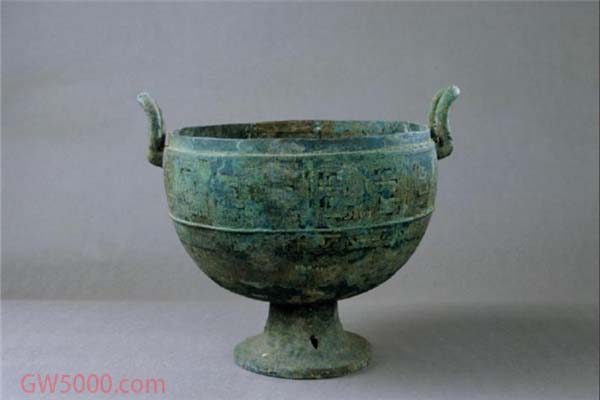 体呈圆形,口微微敛,深腹,圜底,柄较粗矮,口沿下有一对对称的附耳。器身饰变形蟠螭纹,柄上有三个棱形镂孔。