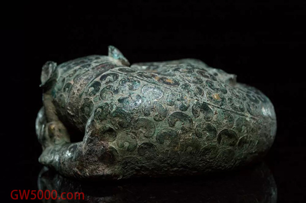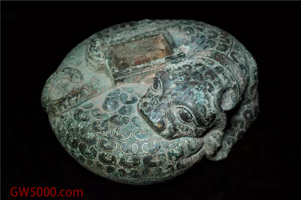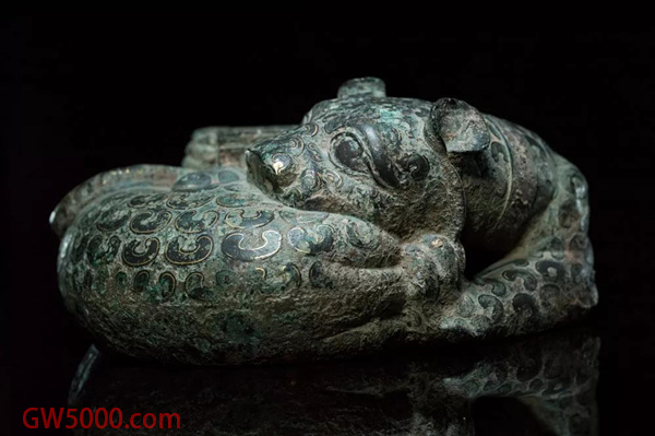 豹曲身盘体呈圆形卧姿,中间有一长方形插孔。豹首大眼、浓眉、立耳,豹身圆润丰满,以金丝银线错出花纹。