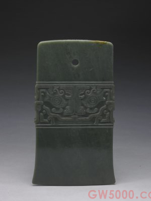 青玉兽面纹斧,清乾隆,高37厘米。碧玉是新疆和阗软玉中的一个品种,软玉主要有白玉、青玉、碧玉、墨玉、黄玉等品种。其中碧玉色如菠菜叶,略有透明感,呈油脂或蜡状光泽。由于所含成分不同,颜色和结构均不如其它软玉均一,色彩淡的呈菜色,色彩深的呈墨绿色,还有斑杂的大环斑状。