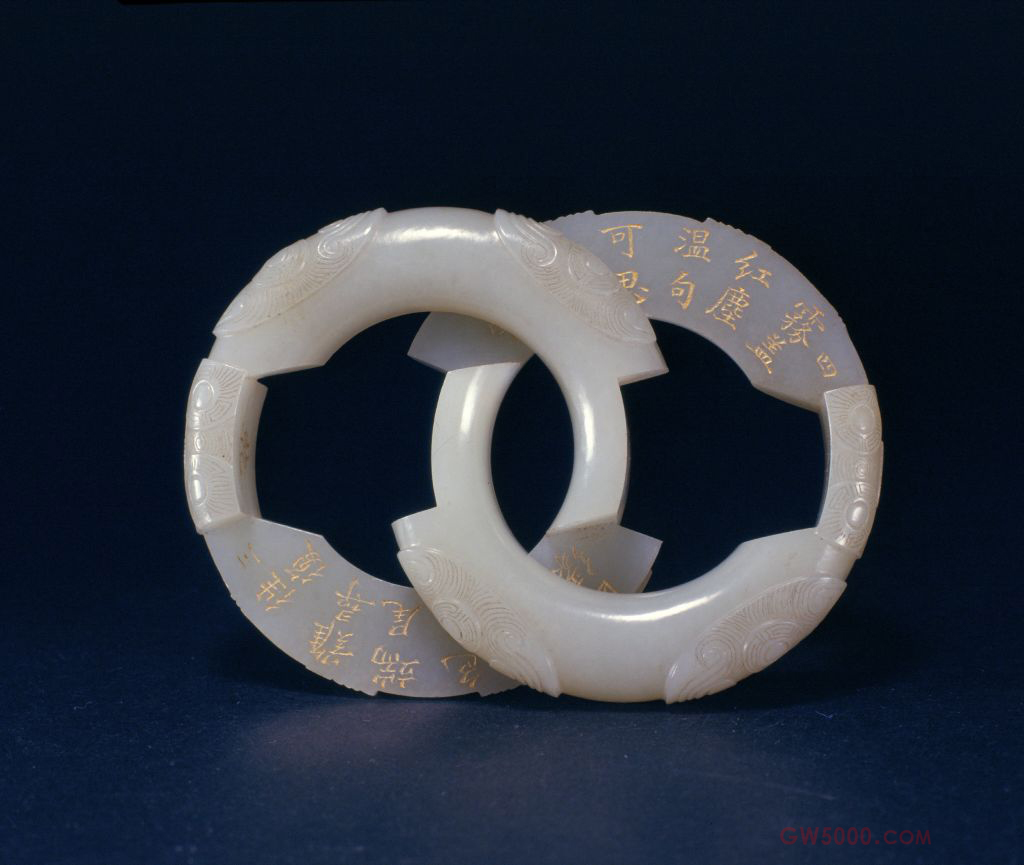 白玉蚩尤环,清乾隆,径7.6厘米,厚1.8厘米。新石器时代良渚文化遗址出土的一种玉环。环的外侧饰有凸起的兽面图案,图案似小饼,贴于环面,数量不多,其间有距离。元人朱德润《古玉图》中称其为“蚩尤环”。