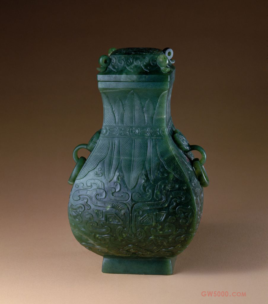 碧玉兽面纹方尊,清乾隆,高24.3厘米,口径7.6厘米,径8×7.6厘米。碧玉是新疆和阗软玉中的一个品种,软玉主要有白玉、青玉、碧玉、墨玉、黄玉等品种。其中碧玉色如菠菜叶,略有透明感,呈油脂或蜡状光泽。由于所含成分不同,颜色和结构均不如其它软玉均一,色彩淡的呈菜色,色彩深的呈墨绿色,还有斑杂的大环斑状。