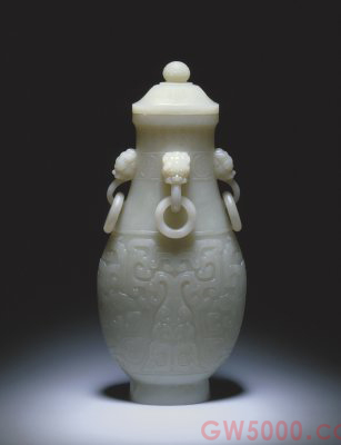 青玉四耳活环夔纹壶,清乾隆,通盖顶高29.5,腹宽13,口径4.5×7.8厘米,足径4.6×7.5厘米。我国传统的装饰纹样之一。夔,神话中形似龙的兽名。《庄子·秋水》中言:“夔怜蚿,蚿怜风。”释文:“夔,一足兽也。……其状如牛,苍色无角,一足能走,出入水即风雨,目光如日月,其音如雷,名曰夔。”