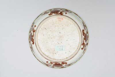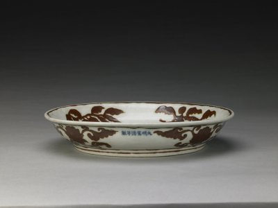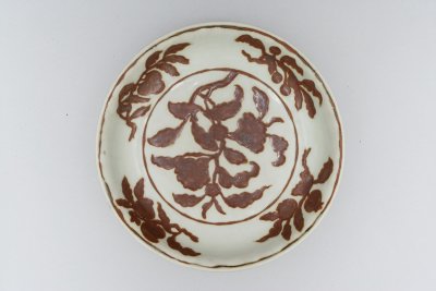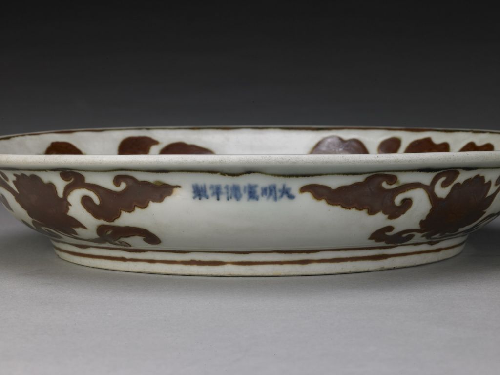 盘撇口,弧壁,圈足。通体白地酱彩装饰。内底饰折枝花纹,内壁饰折枝花果纹,外壁饰缠枝花纹。所有的图案均先暗刻线条。内底、口沿及足墙上均绘有酱彩弦线。圈足内施白釉。外壁口沿下署青花楷体“大明宣德年制”六字款,。