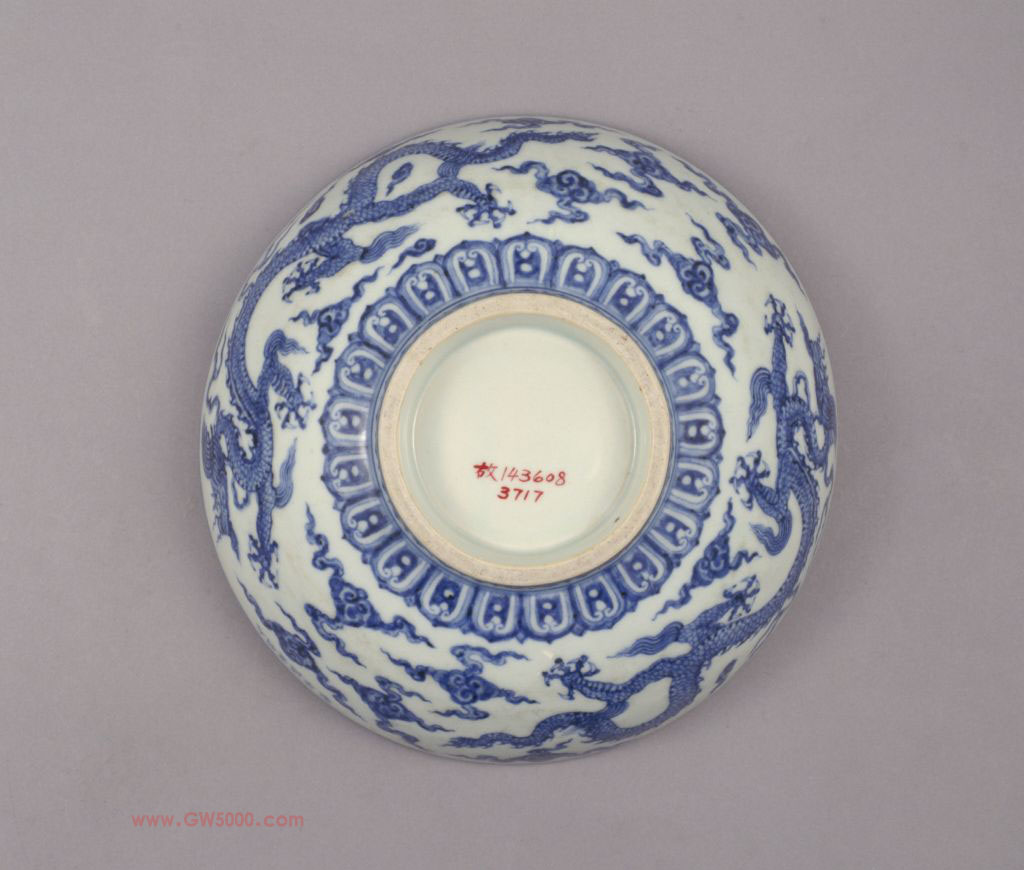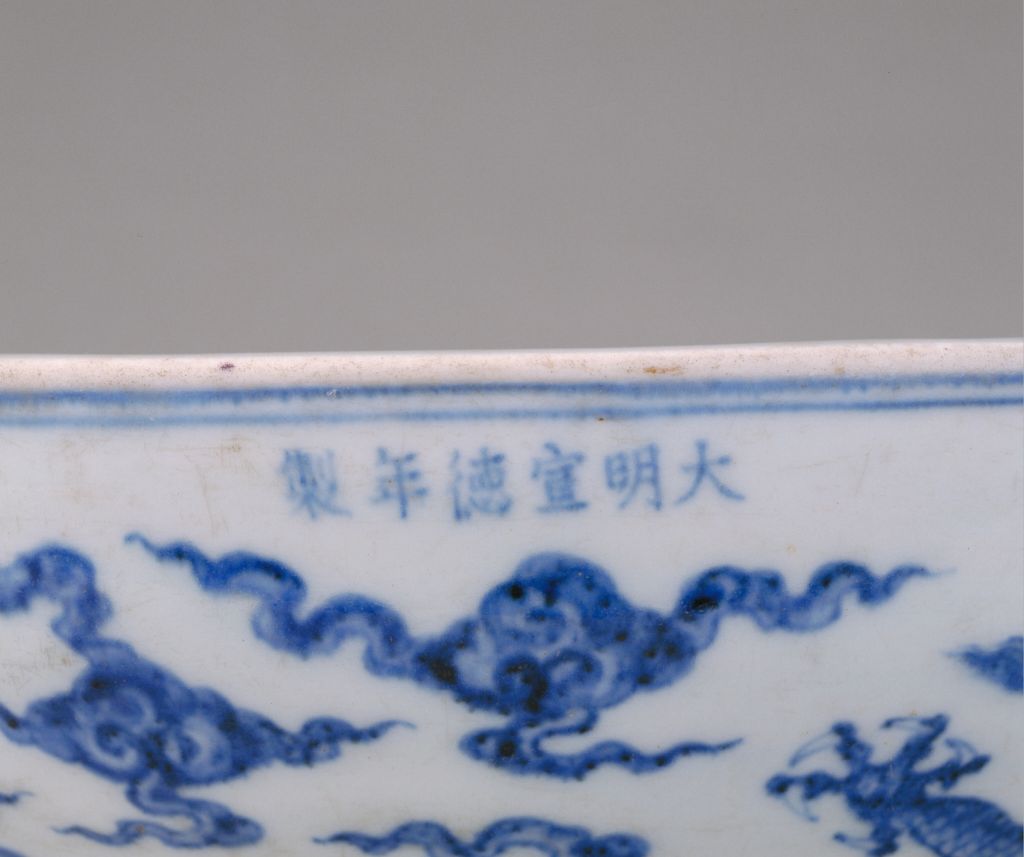 碗敞口,方唇,浅腹,圈足。里白釉无纹饰。外青花装饰。口饰青花线两道,壁饰祥云双龙,近底处饰莲瓣纹,足墙饰如意云头纹。口沿下从右向左横书楷体“大明宣德年制”六字一行款。