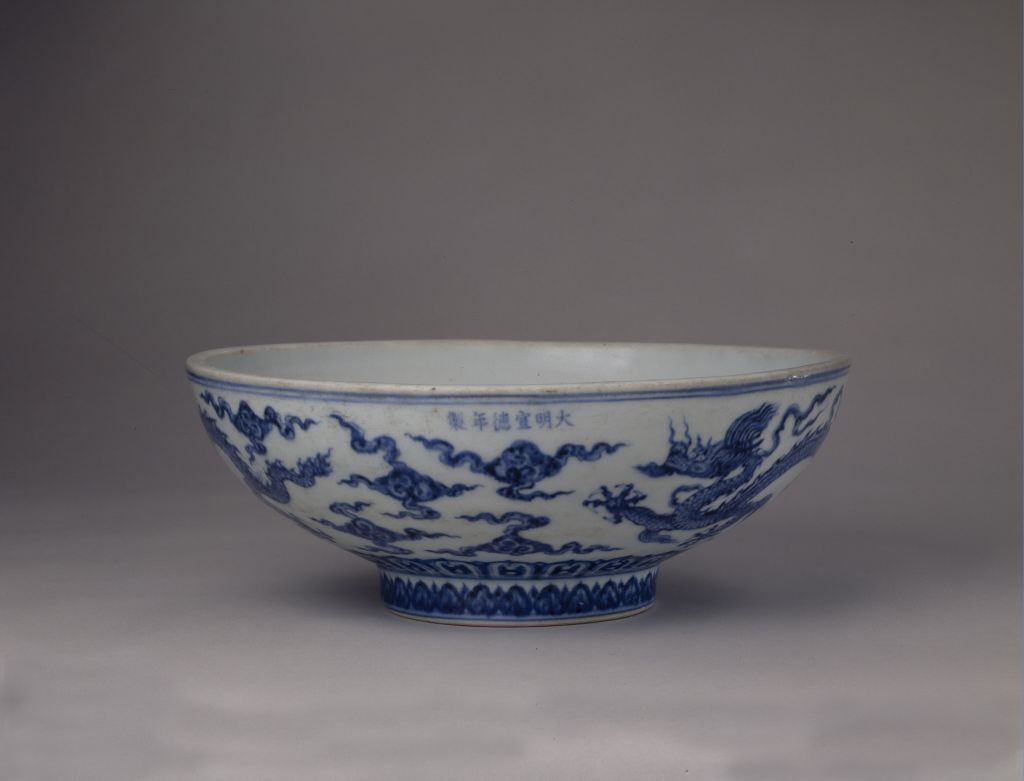 青花云龙纹碗,明宣德,高10.2厘米,口径27.8厘米,足径11.2厘米。清宫旧藏。