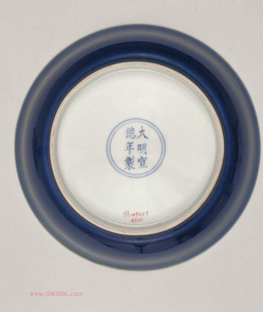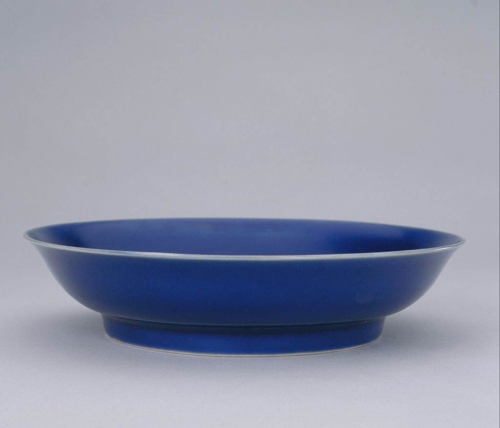 此盘造型规整,釉色纯正,是宣德朝祭蓝釉瓷的典型器。