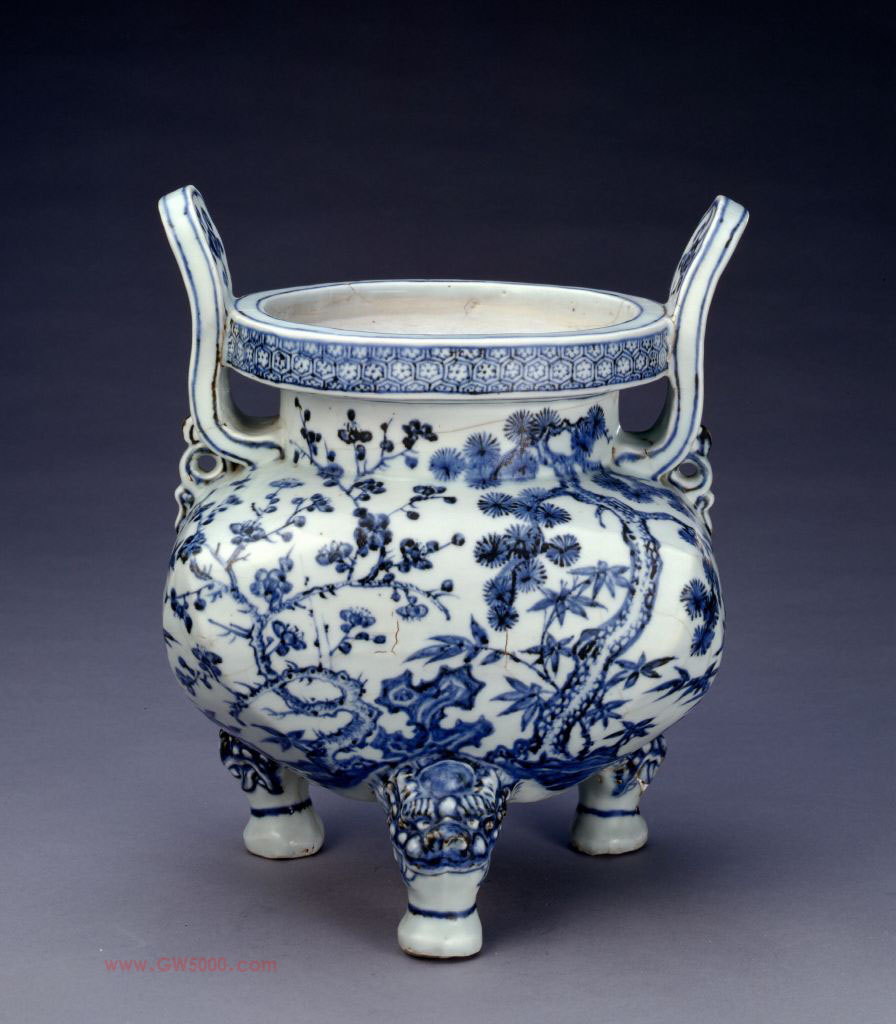 青花松竹梅纹香炉,明宣德,高31.7厘米,口径20.2厘米,足距12厘米。清宫旧藏。
