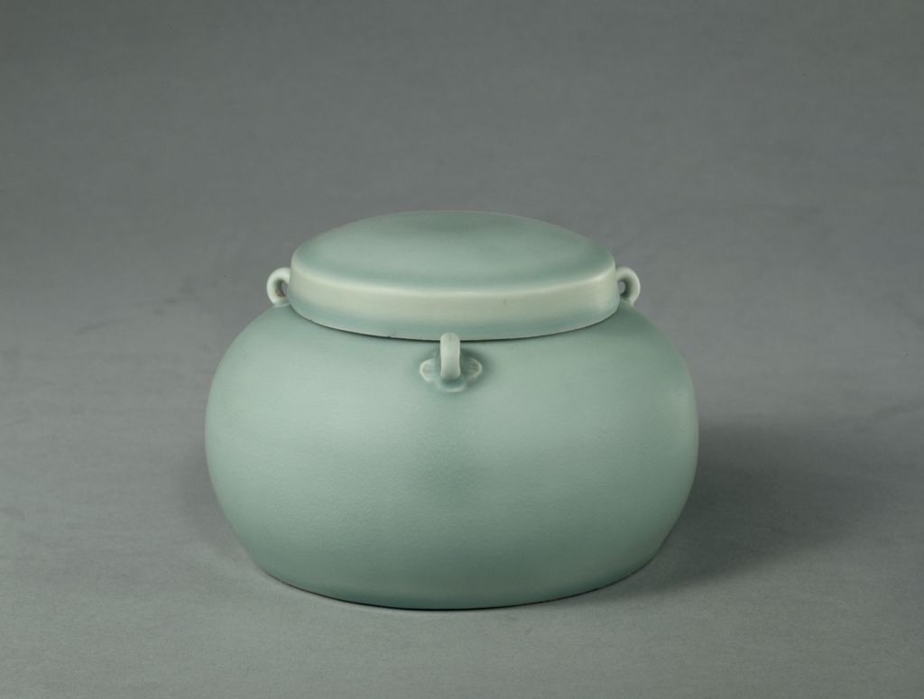 罐直口,扁腹,圈足。肩部有3个环形小系,系下凸起海棠托饰,花瓣上有横线纹。罐里及足内施青白釉,外施翠青釉。直口盖合于罐口。此罐制作规整,胎体细腻,釉色青翠。翠青釉瓷器为永乐时所创,传世品极少。瓷器釉色名,青釉之一种,为明代永乐时所创。釉色青嫩如翠竹,色泽光润,釉中有密集的小气泡。因釉汁垂流,器物肩部色泽淡雅,下部较浓重。