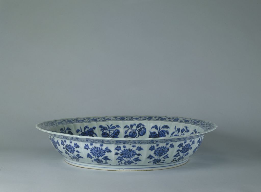 盘折沿,菱花口式,通体作16瓣莲花形,盘心宽大平坦,圈足,细砂底,无款识,露胎处呈现火石红色。青花底釉青白亮丽,厚润透明。盘心主体图案是一只栖于枇杷枝上的绶带鸟,正回首啄食饱满的枇杷果。内壁绘石榴、桃实、荔枝、枇杷等折枝花果,沿面绘大小缠枝莲花,外沿下绘海水江崖纹,外壁绘折枝菊花纹。