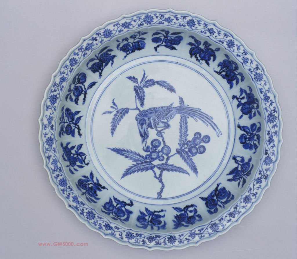 永乐、宣德两朝是我国青花瓷器史上的黄金时代,其青花瓷之胎质、底釉、绘画,无一不精。此盘使用永乐时由西洋进口的“苏泥勃青”料,浓重艳丽,渗入胎骨,并有自然晕散形成的“铁锈斑”,手抚之有凹凸不平之感。国内外现存传世的永乐青花瓷,大盘往往以花卉为装饰题材,用枇杷绶带鸟为主题图案的较少见,就目前已掌握的资料来看,完整的只有三件:日本东京国立美术馆一件,天津艺术博物馆一件,而北京故宫博物院现存的这件最为精美。瓷器釉彩之一,被用作白地蓝花瓷的专称。因蓝花在釉下,所以青花属釉下彩。其原料为含氧化钴的钴土矿,以蓝青色料在瓷胎上描绘纹饰,然后施透明釉,在高温还原焰中一次烧成。元代景德镇已能烧制成熟的青花瓷器。青花瓷器的盛行改变了青瓷为主的局面,成为明、清两代中国瓷器生产的主流。