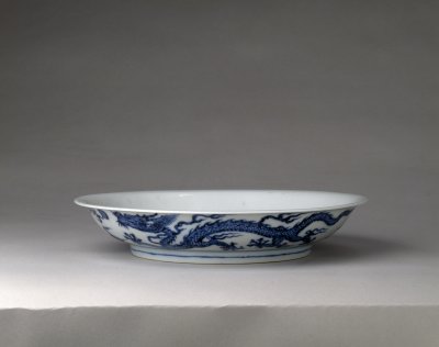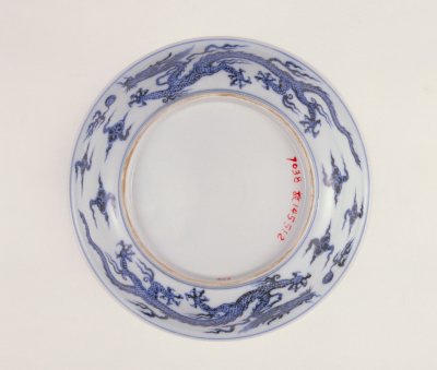此盘胎薄体轻,造型优美,青花发色艳丽,所绘龙纹笔触细腻,生动传神。盘内印、划花纹承袭了元代及明洪武瓷器的作法,反映了景德镇窑瓷器从元至明永乐朝一脉相承之关系。瓷器釉彩之一,被用作白地蓝花瓷的专称。因蓝花在釉下,所以青花属釉下彩。其原料为含氧化钴的钴土矿,以蓝青色料在瓷胎上描绘纹饰,然后施透明釉,在高温还原焰中一次烧成。元代景德镇已能烧制成熟的青花瓷器。青花瓷器的盛行改变了青瓷为主的局面,成为明、清两代中国瓷器生产的主流。